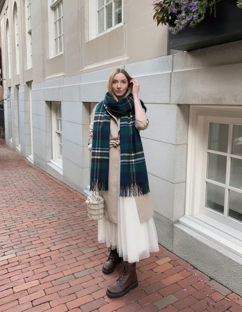 - The Look & Feel: A large, soft scarf in a traditional tartan or plaid. The pattern adds color and a graphic element to an otherwise neutral outerwear palette.