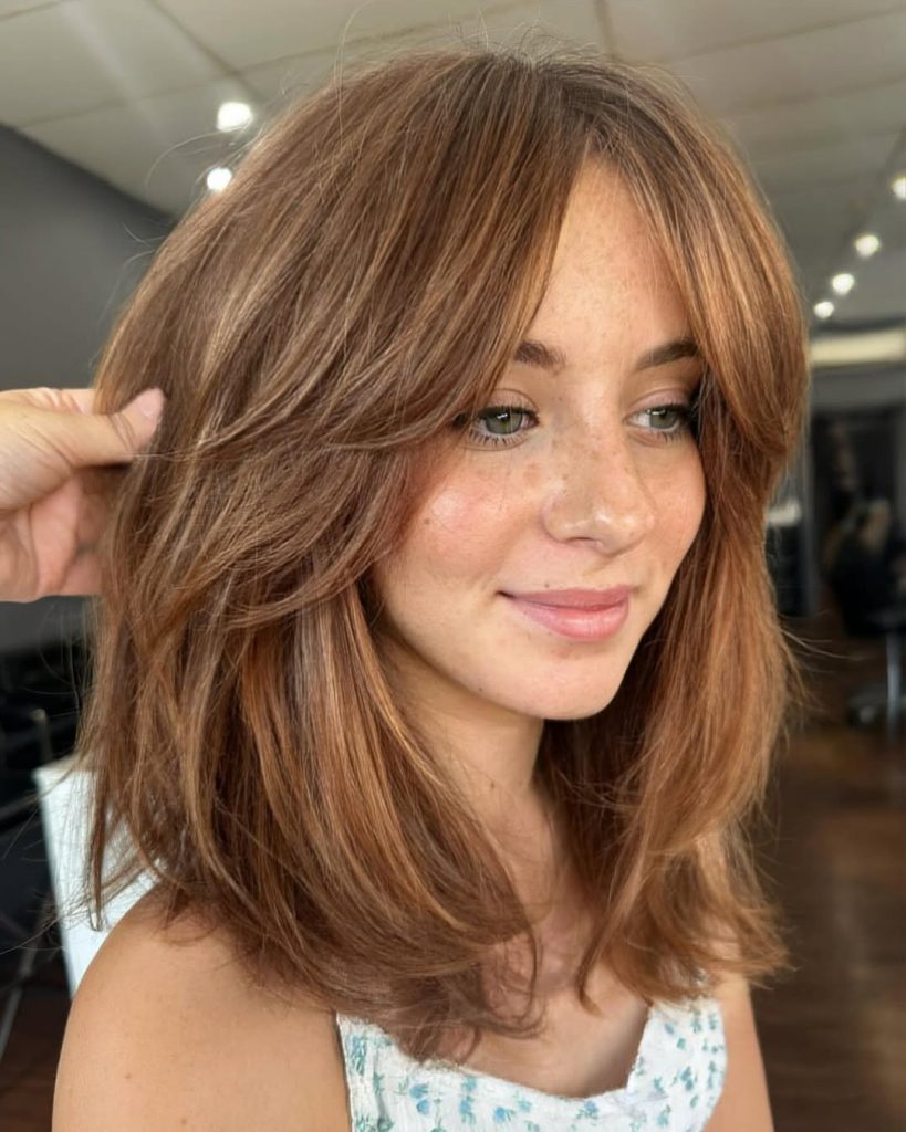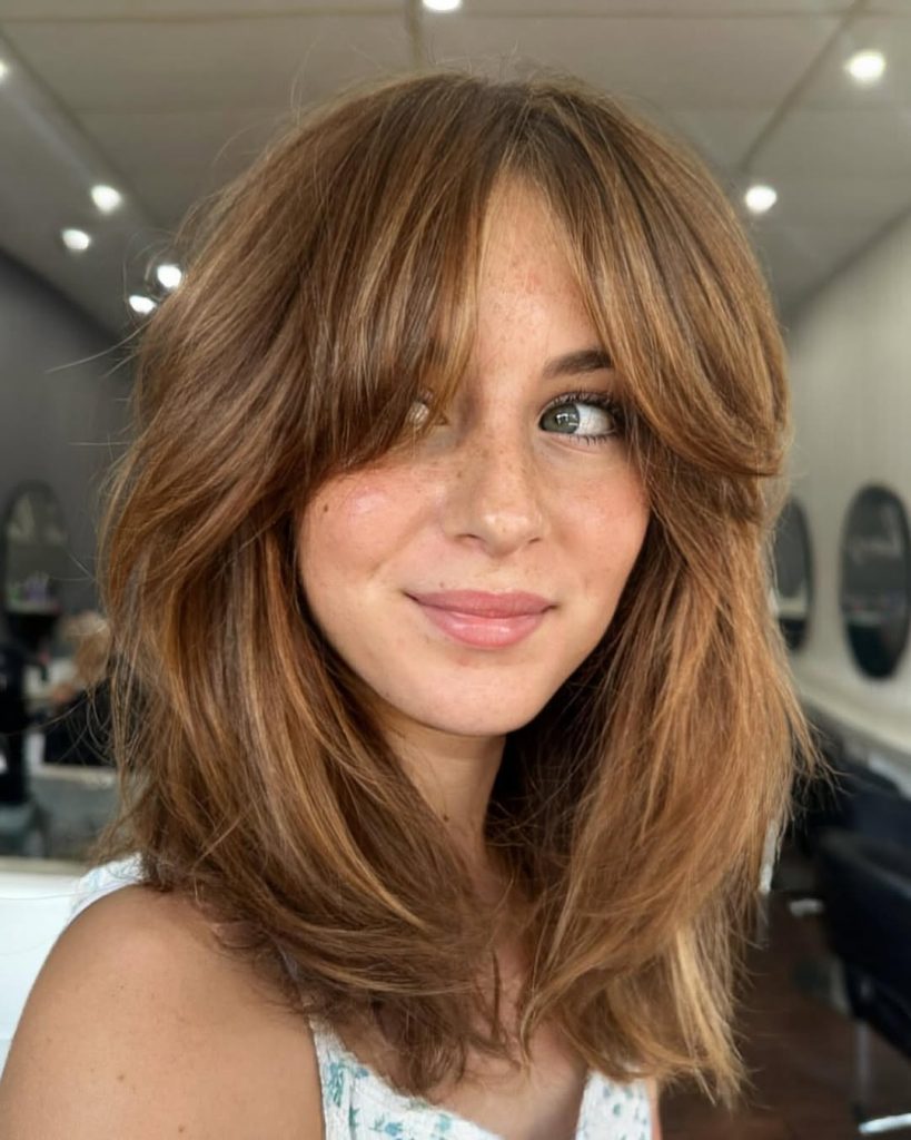 A swooping fringe is a dramatic look that works perfectly with medium-length hair. It adds a youthful and playful element to your style.