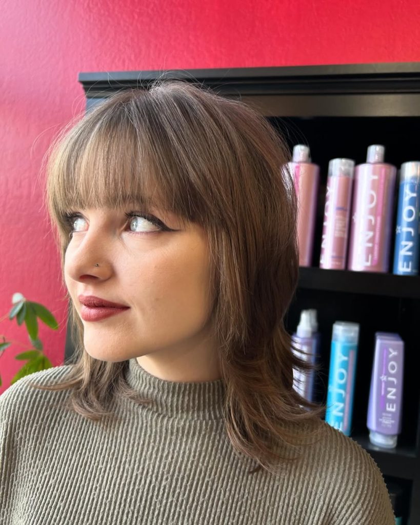 - Ask for choppy layers and blunt bangs.