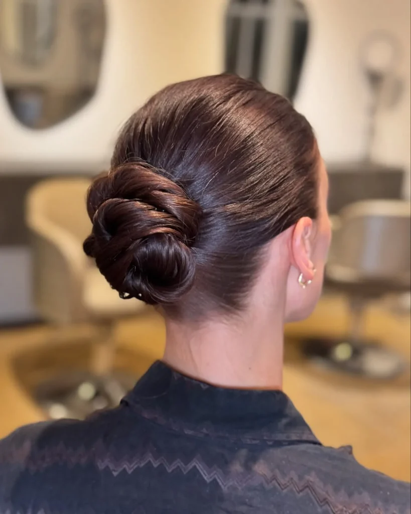 The low twisted chignon is a sophisticated updo that’s perfect for winter events. The twist adds texture, and the low bun keeps hair secure and out of your face, making it ideal for colder months.