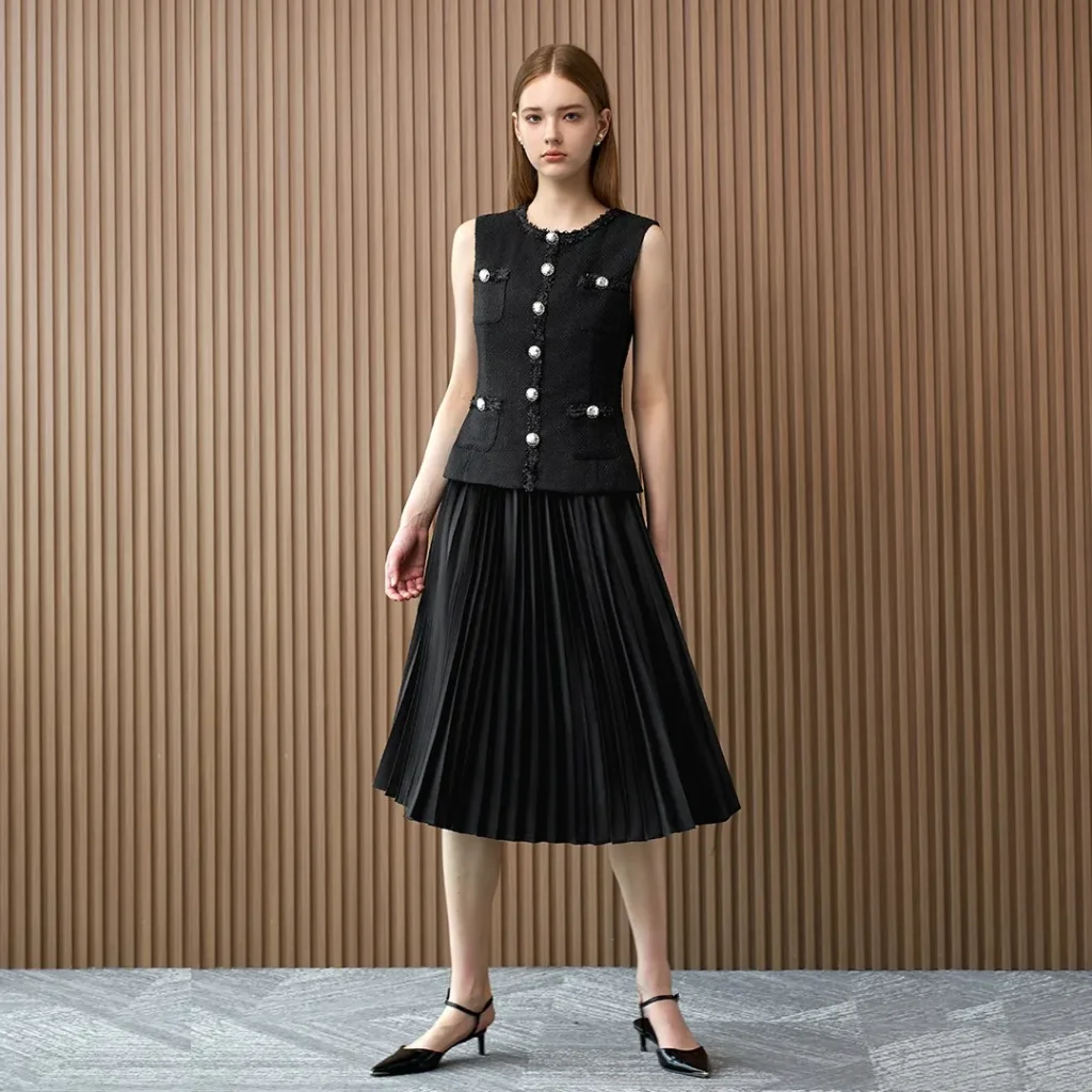 17. Pleated Midi Skirt and Sleeveless Button-Up